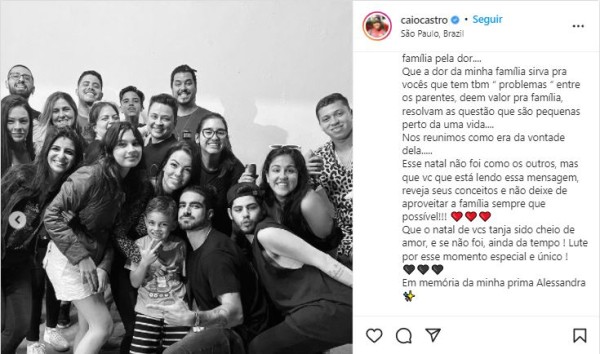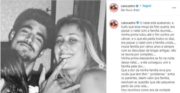 Caio expôs a morte de sua prima, Alessandra. Ela estava travando uma batalha contra um câncer, mas, por conta de complicações da grave enfermidade, não conseguiu resistir e faleceu na noite de Natal.