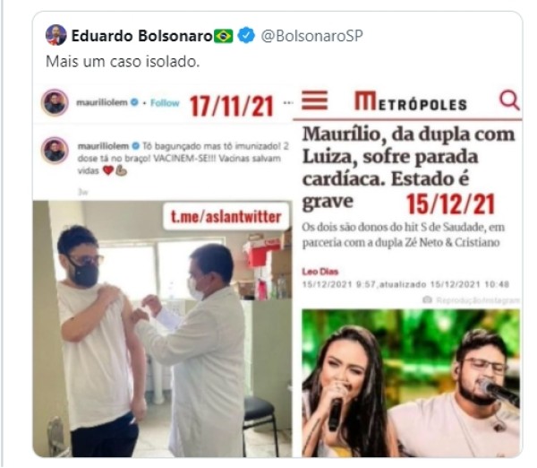 No Twitter, muitos usuários aproveitaram para criticar a falsa notícia de que o cantor morreu após ter sido vacinado contra a Covid-19. Essa polêmica toda começou quando Eduardo Bolsonaro, filho do presidente, divulgou uma fake news dizendo que a vacina contra o novo coronavírus teria sido o motivo do óbito.