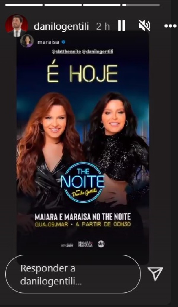 As informações eram de que as cenas faziam parte das gravações do programa de Danilo Gentili. Na manhã desta quarta-feira (09/03), o apresentador confirmou que realmente Maraisa estará na atração noturna, com sua irmã. A publicação foi feita nos Stories do perfil oficial do contratado de Silvio Santos, onde ele conta com mais de nove milhões de seguidores.