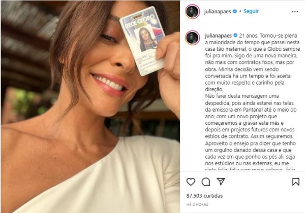 “Sigo de uma nova maneira, não mais com contratos fixos, mas por obra. Minha decisão vem sendo conversada há um tempo e foi aceita com muito respeito e carinho pela direção“, disse Juliana, no começo da publicação.