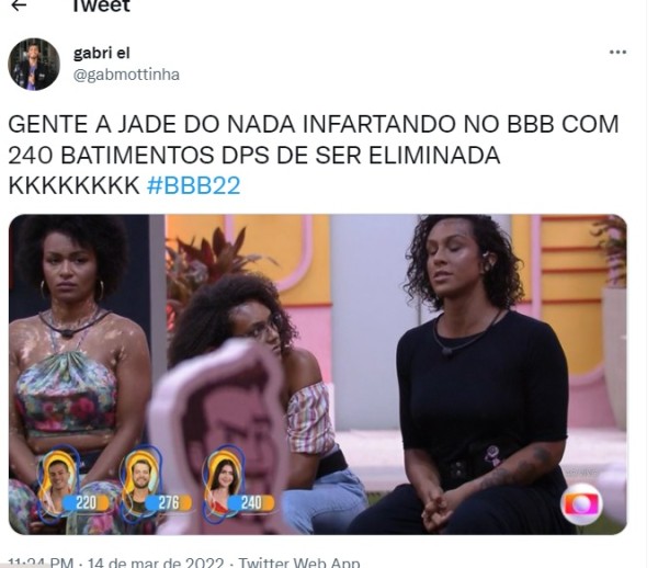 O que aconteceu foi que o editor trocou os nomes na hora de colocar os batimentos dos brothers, apresentando Jade com 240 batimentos por minuto como se a digital influencer ainda estivesse dentro da casa.