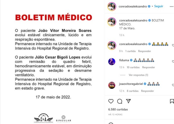 Nesta última segunda-feira (16), o cantor Conrado precisou ser submetido a uma cirurgia para fixação de quadril. No dia seguinte a equipe divulgou novas informações sobre o estado de saúde de João Vitor Moreira Soares, que ficou muito ferido, mas sobreviveu ao acidente com o ônibus da dupla. Seu parceiro, Aleksandro, infelizmente não teve a mesma sorte e faleceu no local.