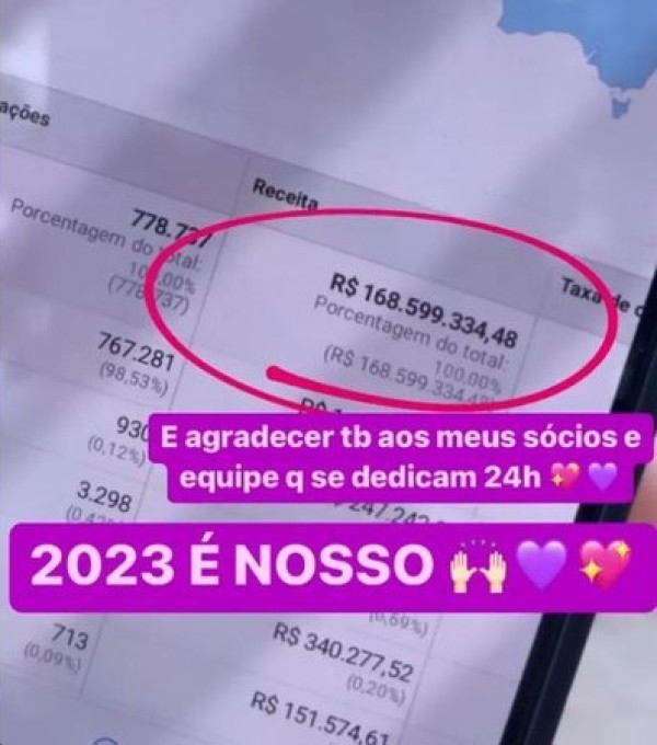A influenciadora digital Virgínia Fonseca usou as redes sociais para mostrar o ótimo resultado da empresa. O faturamento de R$ 168 milhões é elevado e mostra a força da influenciadora e internet. “Sem palavras e muita gratidão no coração! 1 ano e 3 meses de empresa, é surreal”, afirmou Virgínia.