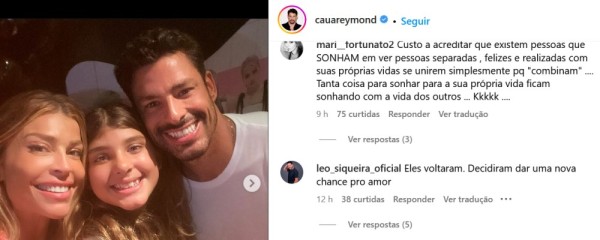 O ator de Terra e Paixão escreveu na foto compartilhada: “Ela não para de crescer. Maior Amor do mundo“. Leo Siqueira deixou uma mensagem no post de Cauã, dizendo o seguinte: “Eles voltaram. Decidiram dar uma nova chance pro amor”.