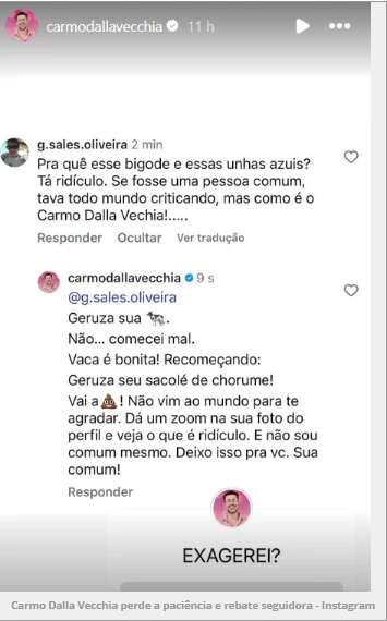 Uma mulher criticou a nova aparência do artista, dando início a uma discussão. “Pra que esse bigode e unhas azuis? Está ridículo. Se fosse uma pessoa comum, estava todo mundo criticando, mas como é o Carmo Dalla Vecchia…”, escreveu a internauta. O ator rebateu, sem papas na língua: “Sua vaca. Não… comecei mal. Vaca é bonita! Recomeçando: Geruza, seu sacolé de chorume! Vai à merda!”.