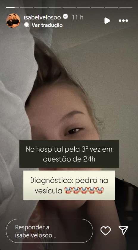 Nos Stories, a influenciadora Isabel compartilhou que as crises de dor devido a problemas na vesícula se intensificaram, causando grande sofrimento. Ela descreveu a dor como excruciante, chegando a pensar que iria morrer.