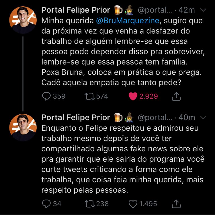 Mais tarde, um perfil ligado ao arquiteto criticou a atriz e lembrou que Felipe Prior, no futuro, pode precisar desse tipo de trabalho para sobreviver. Os fãs de Felipe Prior lembraram que ele elogiou Bruna Marquezine, mesmo sabendo que ela o detonava através das redes sociais.