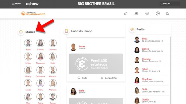 Na Central de Monitoramento, no site do BBB20 no GShow, o público pode conferir todas estas fotos e vídeos também, lembrando que ao lado esquerdo no site tem o ícone de Stories com o rosto de cada um dos participantes em destaque sempre que há um novo post.