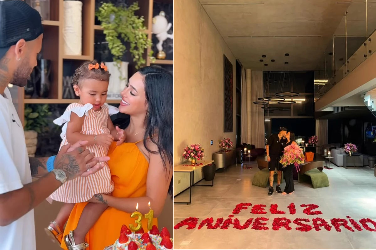 O jogador Neymar surpreendeu a influenciadora digital Bruna Biancardi com uma celebração romântica em comemoração ao aniversário dela, nesta terça-feira (15). A homenagem aconteceu na nova residência do casal, onde o craque preparou um ambiente especial para marcar a data. Com pétalas de rosa formando a frase: “Feliz Aniversário”, no chão, o momento encantou os fãs do casal, após Bruna compartilhar os detalhes nas redes sociais.