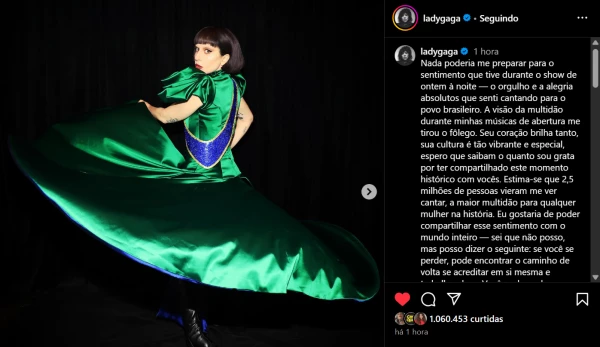 Em uma postagem em seu perfil no Instagram, Lady Gaga compartilhou imagens vestindo um dos figurinos que usou durante a apresentação, notável por suas cores que faziam alusão ao Brasil. “Nada poderia me preparar para o que eu senti durante o show de ontem à noite – o imenso orgulho e alegria de cantar para o povo do Brasil. A visão da multidão durante as primeiras músicas me tirou o fôlego. O coração de vocês brilha intensamente, sua cultura é vibrante e especial. Espero que saibam o quanto eu sou grata por ter compartilhado esse momento histórico com vocês”, disse a famosa.