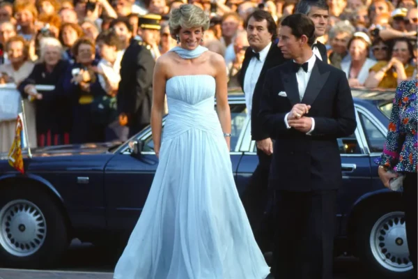 A breve visita de Diana e Charles ao festival teve duração de apenas 10 horas, com uma agenda focada em apoiar o cinema britânico. Durante o evento, o casal real assistiu à exibição do filme As Baleias de Agosto, protagonizado por Bette Davis, e encerrou a noite em um jantar de gala. Pouco depois, embarcaram de volta a Londres. Mas apesar da curta passagem, o impacto visual e simbólico de Diana naquele dia se eternizou — muito por conta de seu vestido. O modelo em tule azul, com decote tomara-que-caia, era complementado por um lenço esvoaçante de chiffon da mesma tonalidade, que se movia com o vento da Riviera Francesa, criando uma imagem cinematográfica e poética que marcou a memória coletiva da época.