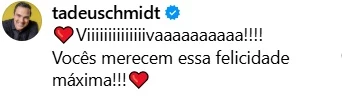 Logo após a publicação de Bruno, Tadeu Schmidt reagiu à notícia com muito entusiasmo. O apresentador do Big Brother Brasil, da TV Globo, deixou um comentário afetuoso na postagem, expressando o quanto está feliz pelo nascimento dos sobrinhos-netos. Ele ressaltou que Bruno e Lais merecem toda a alegria do mundo, celebrando a chegada dos bebês com carinho e orgulho. “Viiiiiiiiiiiiiivaaaaaaaaaa!!!! Vocês merecem essa felicidade máxima!!!”, escreveu.