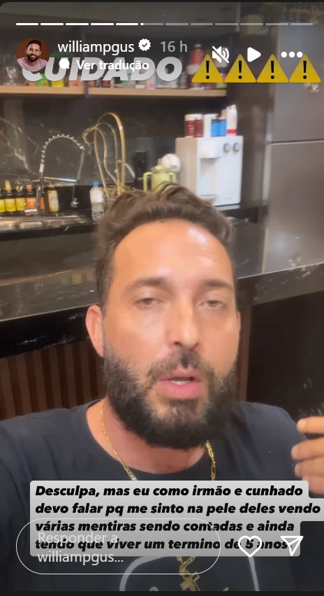 Em seguida, William também escreveu no story: “Desculpa, mas eu como irmão e cunhado devo falar porque me sinto na pele deles vendo várias mentiras sendo contadas e ainda tendo que viver um término de 5 anos”.