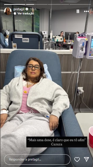 Em um story publicado no Instagram, Preta Gil aparece deitada na cadeira do hospital, pronta para receber mais uma dose do tratamento. Com bom humor e resiliência, ela legendou a imagem com um trecho da música “Por Que a Gente É Assim?”, eternizada por Cazuza.