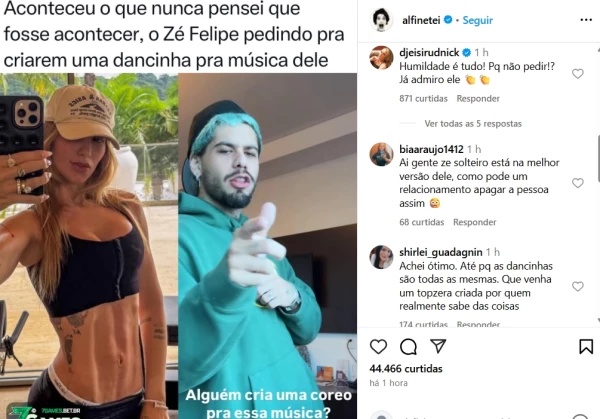 Na ocasião, Zé Felipe escreveu: “Alguém cria uma coreo pra essa música?“. A solicitação do cantor gerou diversas reações entre os internautas. Muitos brincaram com a situação, fazendo referência ao papel de Virginia na criação das famosas dancinhas que viralizavam nas plataformas digitais.