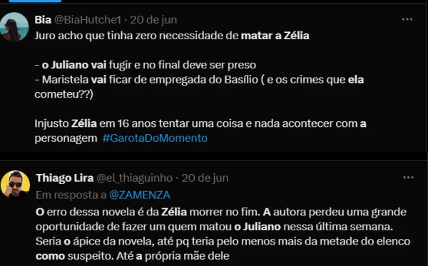 Entre os comentários, alguns lamentaram que Zélia tenha sido punida enquanto outros vilões escaparam de consequências mais severas. A opinião de que Juliano deveria ser preso sem causar mais vítimas foi recorrente, assim como críticas ao destino leve de Maristela (Lilia Cabral).