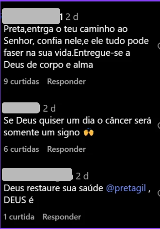 A maioria das mensagens recebidas expressava apoio e encorajamento, revelando solidariedade e votos de recuperação para a artista. Nas redes sociais, muitos usuários manifestaram-se com comentários que refletiam fé e esperança, incentivando a confiança em um poder superior para superar a situação.