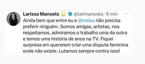 Ela destacou que mantém uma relação de amizade com Maisa desde os tempos de Carrossel (2012). “Somos amigas, artistas, nos respeitamos, admiramos o trabalho uma da outra e temos uma história de anos na TV“, escreveu Larissa. “Fiquei surpresa em quererem criar uma disputa feminina onde não existe. Lutamos sempre contra isso“, completou.