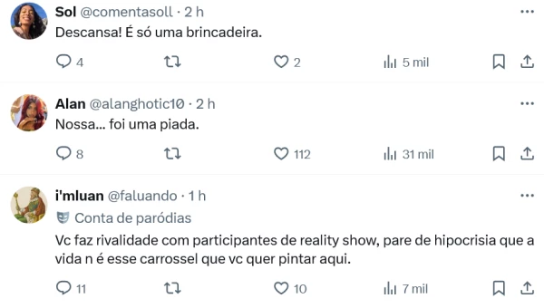 Outros usuários do X minimizaram a situação e disseram que se tratava apenas de uma piada. “Foi só uma brincadeira”, comentou um. “Imagina ser tão chata assim a ponto de não entender uma piada“, disparou outro.