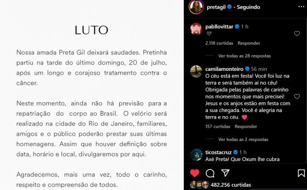 Nesta segunda-feira, 21 de julho, o perfil oficial de Preta Gil fez sua primeira publicação após o falecimento da cantora. Ela nos deixou no último domingo, 20 de julho, aos 50 anos, em decorrência de um câncer no intestino. A nota divulgada começa assim: “Luto! Nossa amada Preta Gil deixará saudades. Pretinha partiu na tarde do último domingo, 20 de julho, após um longo e corajoso tratamento contra o câncer”.