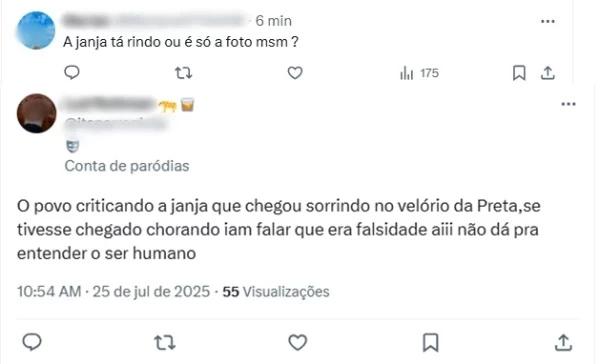 A repercussão nas redes sociais foi rápida e intensa, com usuários criticando duramente a atitude de Janja. Comentários como “Falta de respeito sorrir em um momento desses” e “Quer palco né??? Ela tem que biscoitar kkkk” dominaram as discussões, refletindo a insatisfação de parte do público diante do comportamento da primeira-dama. Alguns questionaram se o sorriso seria uma expressão de nervosismo ou desrespeito, enquanto outros fizeram comentários mais ácidos, sugerindo que ela estaria buscando atenção ou protagonismo na situação delicada.