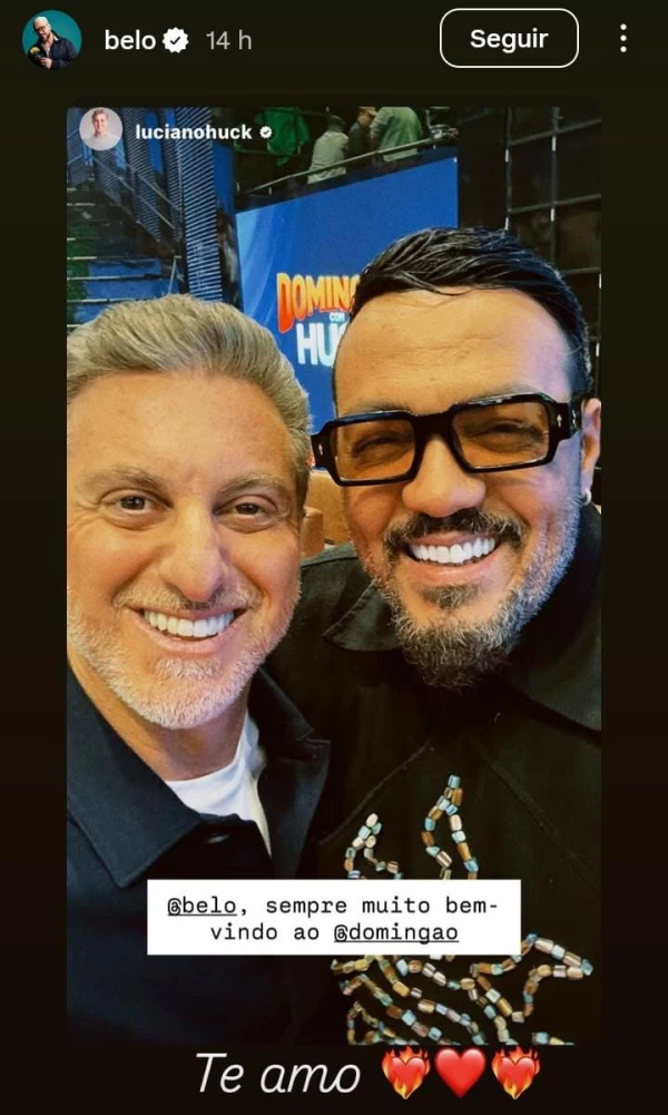 “Te amo”, escreveu Belo, ao compartilhar em suas redes sociais o registro carinhoso publicado por Luciano Huck. Além de falar sobre o apresentador em suas redes sociais, o cantor também fez posts na companhia de outros artistas que também marcaram presença no palco do Domingão.