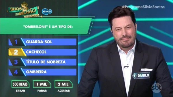 A segunda pergunta, que valia R$ 2 mil, foi fatal. “Ombrelone é um tipo de:” foi o questionamento apresentado. As alternativas eram: guarda-sol, cachecol, título de nobreza e ombreira. Danilo chegou a cogitar pedir ajuda aos universitários Luiz Bacci, Rebeca Abravanel e Luiz Possi, mas optou por arriscar.