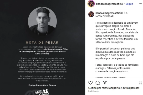 Hoje a gente se despede de um jovem que carregava alegria no olhar e sonhos no coração”, diz o comunicado da banda, que também prestou solidariedade ao pai de Ronald, conhecido como Torcedor. A mensagem reforça o carinho e o apoio à família neste momento de dor.