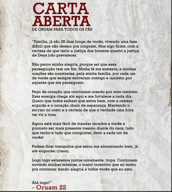 “CARTA ABERTA DE ORUAM PARA TODOS OS FÃS. Família, já são 25 dias longe de vocês, vivendo uma fase difícil que não desejo pra ninguém. Mas sigo firme, com a certeza de que tanto a justiça dos homens quanto a justiça de Deus irão prevalecer. Não perco minha alegria, porque sei que essa perseguição tem um fim. Minha fé me sustenta, e minhas orações são constantes, pela minha família, por cada um de vocês que sempre estiveram comigo e também por aqueles que me perseguem”, começou o cantor.