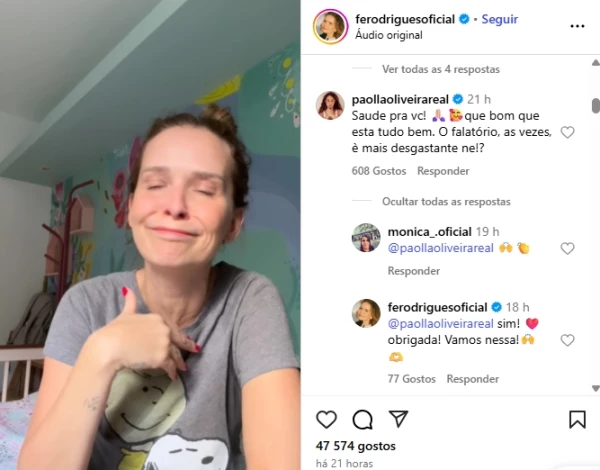 Fernanda Rodrigues recebeu o apoio de diversas famosas. “Saúde pra você! Que bom que está tudo bem. O falatório, às vezes, é mais desgastante né!?”, comentou a atriz Paolla Oliveira. “Sim! Obrigada! Vamos nessa”, respondeu Fernanda. Mariana Ximenes e Samara Felippo foram outras famosas que se manifestaram.