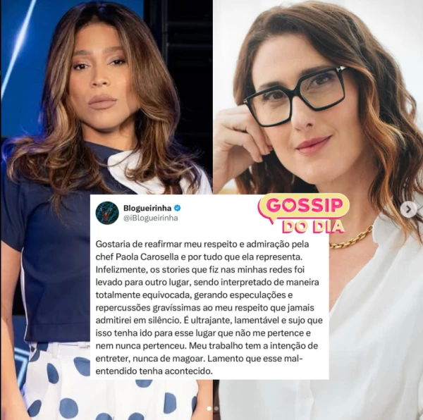 “Gostaria de reafirmar meu respeito e admiração pela chef Paola Carosella e por tudo que ela representa. Infelizmente, os stories que fiz nas minhas redes foram levados para outro lugar, sendo interpretados de maneira totalmente equivocada, gerando especulações e repercussões gravíssimas ao meu respeito que jamais admitirei em silêncio”, declarou.