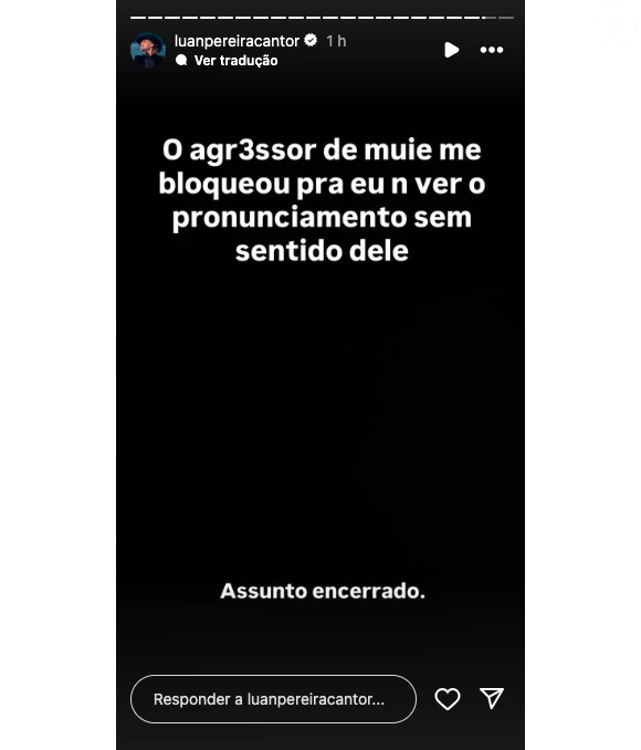 Após a publicação de um vídeo de Dado Dolabella, no qual ele apresenta sua versão dos fatos defendendo-se das alegações de agressão, Luan Pereira não se calou e usou suas redes sociais para rebater duramente o ex de Wanessa Camargo. Em seus stories no Instagram, Luan Pereira afirmou que Dado o bloqueou e que seu pronunciamento era sem sentido. “Agr3ssor de muie”, disparou o sertanejo ao se manifestar nas redes sociais. Em outro momento ele declarou de forma categórica: “Assunto encerrado”.