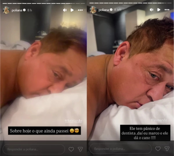 Depois de faltar a um compromisso com o dentista para curtir uma noite com os amigos, o cantor Leonardo se tornou alvo de comentários. O caso foi divulgado por sua esposa, Poliana Rocha, que postou um vídeo íntimo dele de ressaca, ainda na cama, visivelmente sonolento. De acordo com Poliana, ele não foi à consulta marcada, optando por se divertir. No vídeo, ela faz piada com a aversão que o marido tem a dentistas.