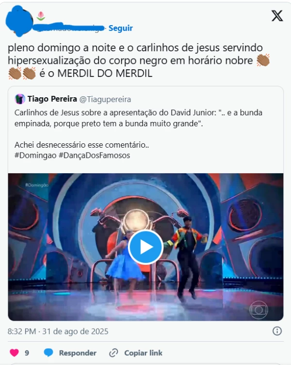 No X, antigo Twitter, internautas comentaram a performance e compartilharam suas impressões sobre a performance de David Junior. “Pleno domingo à noite e o Carlinhos de jesus servindo hipersexualização do corpo negro em horário nobre. É o merdil do merdil”, detonou um internauta. “Que papo torto do Carlinhos de Jesus, júri técnico, sobre o David Junior. Desnecessário”, disparou outro.