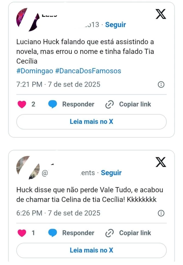 A repercussão foi intensa nas redes sociais, onde internautas alfinetaram Luciano Huck após o ocorrido no Domingão. Comentários como “Luciano Huck falando que está assistindo a novela, mas errou o nome” e “Huck disse não perder Vale Tudo, e acabou de chamar tia Celina de Tia Cecília” chamaram a atenção na plataforma X, antigo Twitter. Enquanto isso, a competição Dança dos Famosos segue fervendo, com participantes se destacando, como Nicole Bahls, que brilhou e conquistou a plateia após um início conturbado. A ex-panicat agora ocupa o terceiro lugar no ranking de competidores, atrás apenas de Manu Bahtidão e Allan Souza Lima.