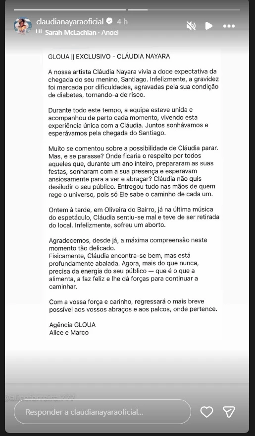 A gravidez de Cláudia Nayara já era considerada delicada, pois a cantora convivia com o diagnóstico de diabetes. Mesmo diante das recomendações médicas para reduzir a rotina, ela optou por seguir com sua agenda de shows. Segundo a artista, não queria frustrar o público que aguardava suas apresentações e confiava que tudo daria certo. Infelizmente, durante uma apresentação em Lisboa, a artista passou mal no palco, no domingo (14), e perdeu o bebê.