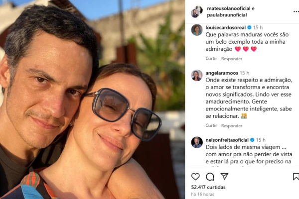 Na nota oficial, Mateus e Paula escreveram: “Após 17 anos juntos, seguimos preservando nossa parceria com carinho e muito amor na criação de nossos filhos, torcendo um pelo outro e com futuros planos profissionais juntos. Nossa história não termina, apenas se transforma”.