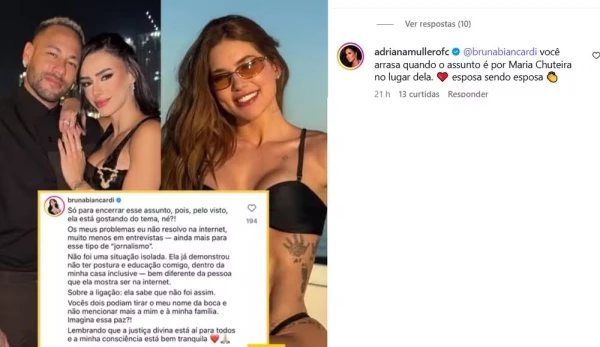 Em um comentário em redes sociais, Adriana se posicionou a favor da mãe de Mavie e Mel. “Bruna, você arrasa quando o assunto é colocar Maria Chuteira no seu devido lugar. Esposa sendo esposa”, escreveu Adriana com tom crítico a ex-esposa de Zé Felipe.