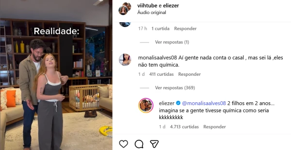 O influenciador Eliezer e a empresária Viih Tube publicaram uma brincadeira no Instagram na última sexta-feira (26), e acabaram recebendo comentários negativos. Um internauta afirmou que o casal não tinha química, o que gerou irritação no pai da pequena Lua. O ex-BBB respondeu de forma irônica à crítica.