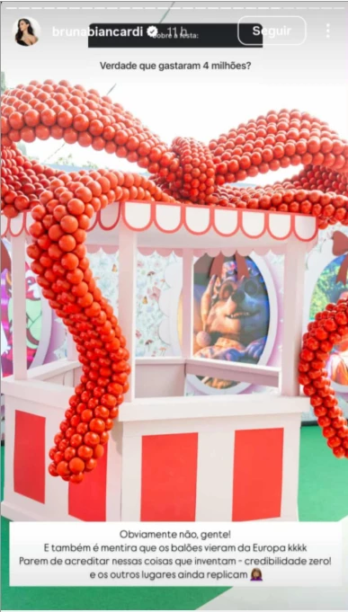 Ao ser questionada sobre o evento, a influenciadora refutou as especulações que circulavam na mídia, negando os rumores de que o custo da celebração teria chegado a R$ 4 milhões e que balões teriam sido importados da Europa especialmente para a ocasião. “Obviamente não, gente! E também é mentira que os balões vieram da Europa. Parem de acreditar nessas coisas que inventam – credibilidade zero! E os outros lugares ainda replicam!”, disparou a influenciadora.