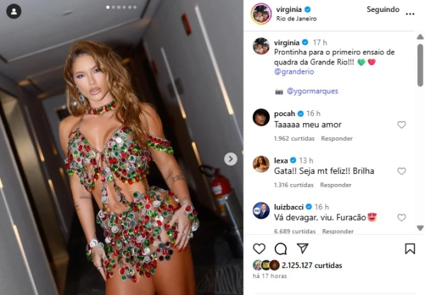 Durante um ensaio da escola de samba Grande Rio, realizado no último fim de semana, a influenciadora Virginia Fonseca chamou atenção ao surgir com um look considerado ousado por parte do público. A roupa, composta por um body cavado e botas de cano alto, foi usada durante sua participação como destaque da agremiação, que se prepara para o Carnaval 2025.