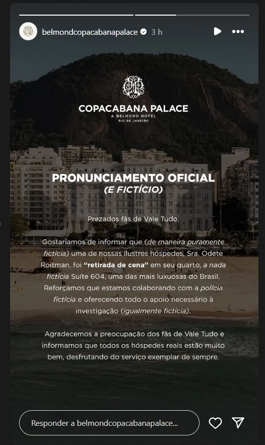 Diante da repercussão, a equipe do hotel decidiu se pronunciar oficialmente nas redes sociais, aproveitando a ocasião para esclarecer que tudo se tratava de ficção. Nos stories do Instagram, o Copacabana Palace publicou um comunicado bem-humorado sobre o episódio, destacando a participação da icônica personagem e tranquilizando os fãs quanto à segurança do local.