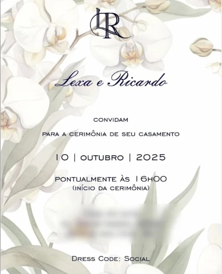 A jornalista Fábia Oliveira teve acesso exclusivo ao convite do casamento, que trazia um estilo delicado e sofisticado, indicando informações como horário e sugestão de traje social, sinalizando uma celebração formal, à noite, com decoração refinada.
