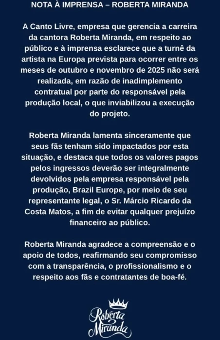 A cantora Roberta Miranda anunciou o cancelamento da turnê que faria na Europa entre outubro e novembro de 2025. A decisão foi divulgada em um comunicado publicado no Instagram neste domingo (12/10).