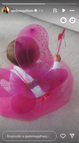A fantasia escolhida por Jade inclui asas cor-de-rosa com detalhes dourados e um adorno em forma de borboleta. A composição lúdica foi registrada em ambiente discreto, destacando o visual delicado da bebê. A faixa rosa na cintura completava o figurino, que remete ao universo infantil com leveza.