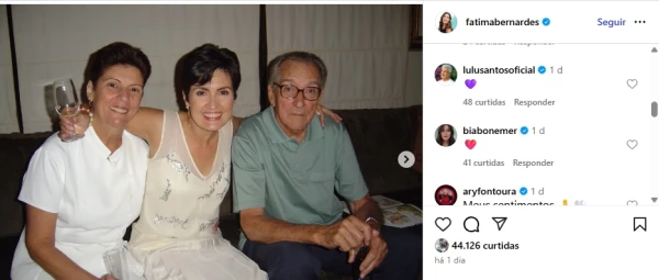 A publicação se tornou uma das mais comentadas do perfil de Fátima, que recebeu centenas de mensagens de carinho. A filha da apresentadora, Bia Bonemer, também se manifestou. A jovem postou um emoji de coração na publicação da mãe.