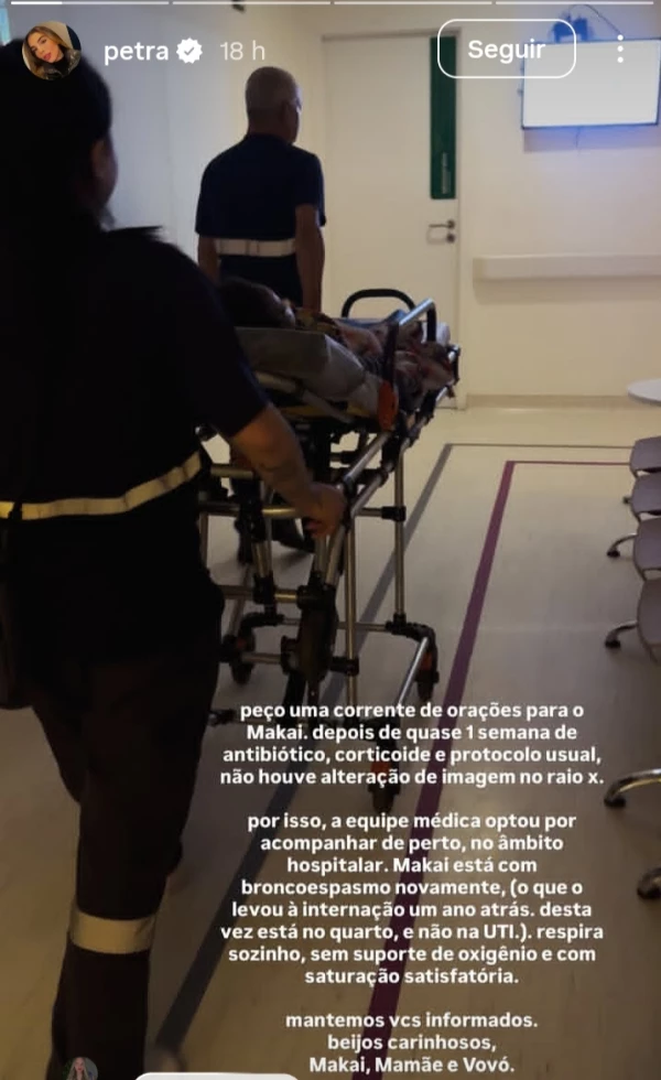 Makai é fruto do relacionamento de Petra com o lutador Ademir Barreto de Araújo. A influenciadora, que cria o menino sozinha, costuma compartilhar nas redes sociais momentos da rotina ao lado do filho. Esta é a segunda vez que o pequeno enfrenta um quadro de broncoespasmo, condição que provoca dificuldade para respirar, mas, segundo Petra, o menino está reagindo bem ao tratamento e segue em observação médica.