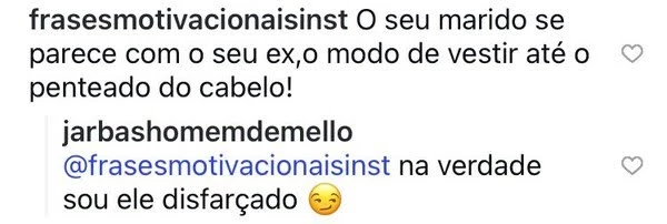 Nos comentários, um internauta escreveu para Cláudia: “O seu marido se parece com o seu ex, do modo de se vestir até o penteado”. Sem se abalar, Jarbas decidiu responder à observação com uma dose de ironia e simpatia. “Na verdade, eu sou ele [Edson Celulari] disfarçado”, brincou o ator e diretor, arrancando risadas dos seguidores.
