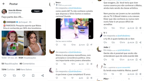 O post, feito por um perfil de celebridades, apresentava os resultados de uma suposta pesquisa indicando que 96% da população brasileira conhecia Maisa, que começou a carreira ainda criança no SBT. José de Abreu compartilhou o conteúdo no X, antigo Twitter, e escreveu de forma sarcástica: “Faço parte dos 4%”, em referência ao grupo que, segundo o levantamento, não conhecia a atriz.