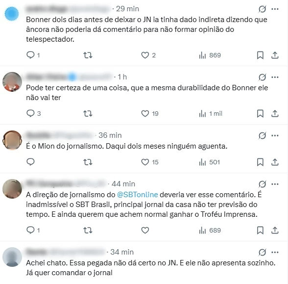 “Achei chato. Essa pegada não dá certo no JN. E ele não apresenta sozinho. Já quer comandar o jornal”, criticou mais um. “É o (Marcos) Mion do jornalismo. Daqui dois meses ninguém aguenta”, postou outro, citando o apresentador do Caldeirão. “Achei chato”, criticou outro.